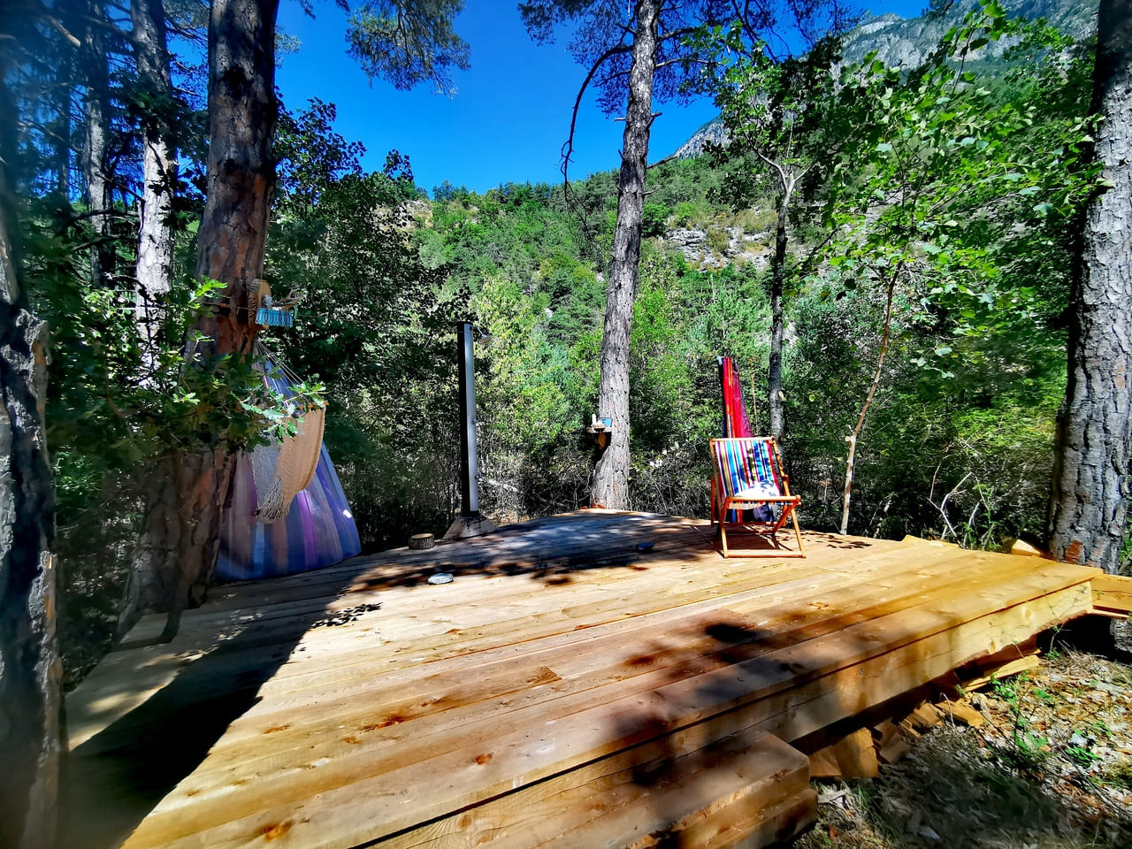 Installé au bord de la rivière Ubaye, au départ de la célèbre « Classique » du Martinet-Lauzet — l’une des descentes les plus emblématiques en rafting et kayak de la vallée — la base s’intègre au cœur d’une forêt de conifères.